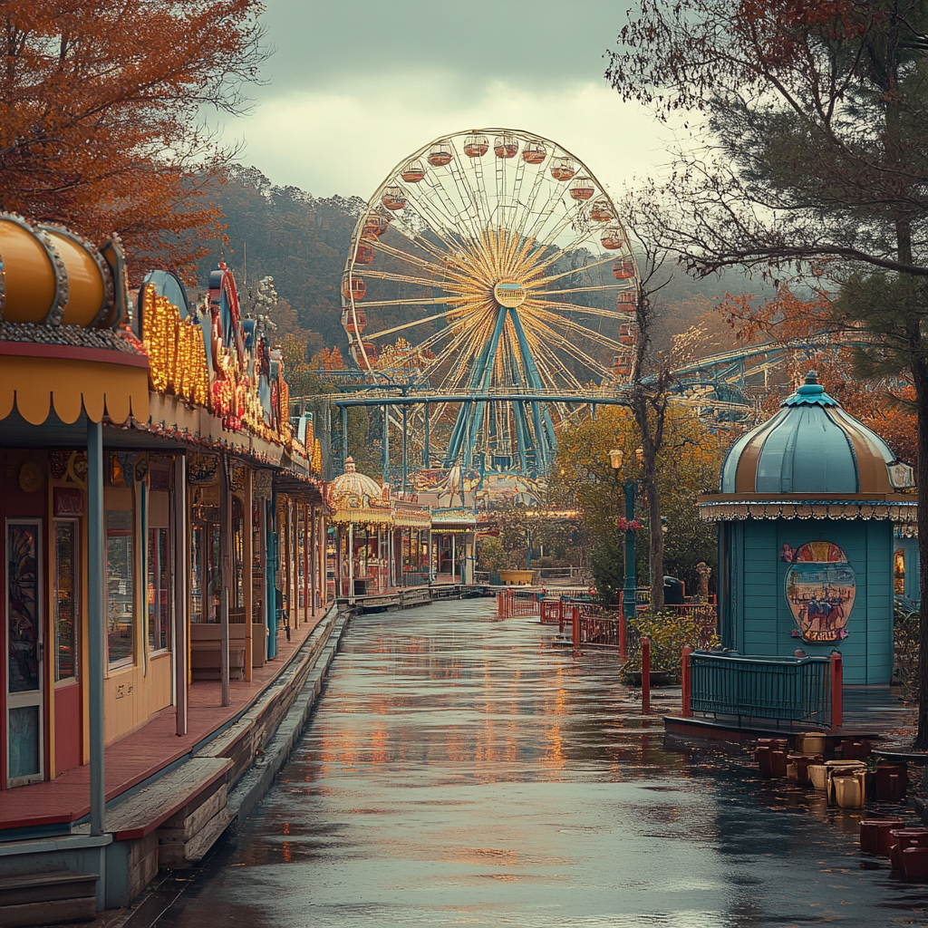 A serene amusement park scene unfolds, featuring a towering Ferris wheel and vibrant carousel, framed by fall foliage. The wet pathways reflect the glow of lights, adding to the magical and tranquil atmosphere.