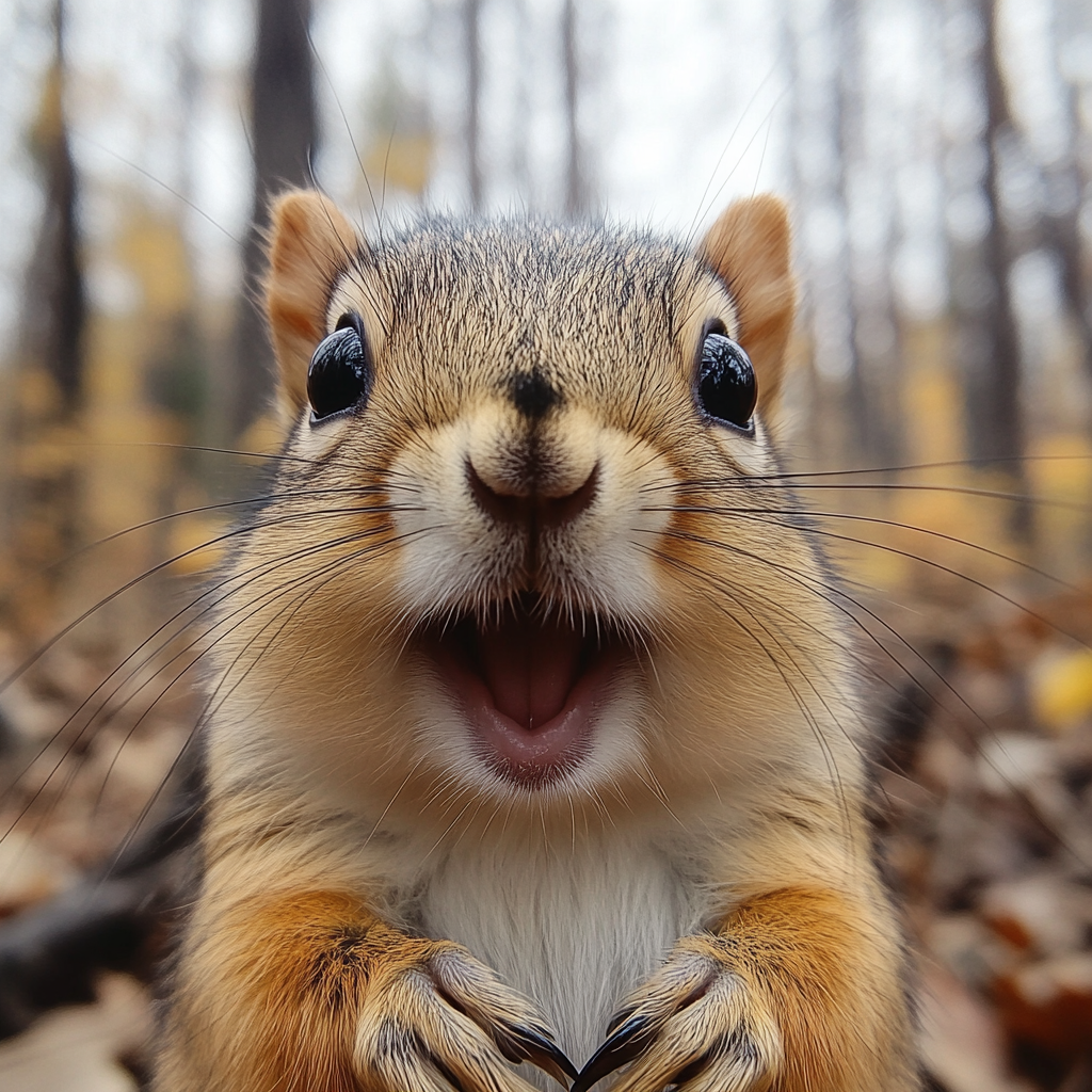 A playful squirrel with wide, gleeful eyes and an open-mouthed smile looks straight into the camera, radiating joy and energy amidst the autumn woods. An irresistible burst of cuteness!