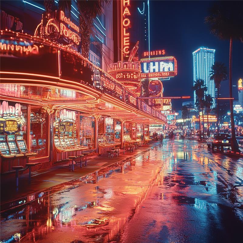 A dazzling display of neon lights reflects on the rain-slick streets of a bustling casino strip. The vibrant glow captures the electric energy of a city that never sleeps.