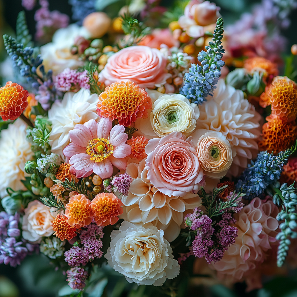 A kaleidoscope of colors bursts forth in this exquisite floral arrangement, featuring delicate roses, dahlias, and marigolds interwoven with lavender sprigs and lush greenery. This bouquet celebrates nature’s diversity and artistry, creating a vibrant harmony of textures and hues.