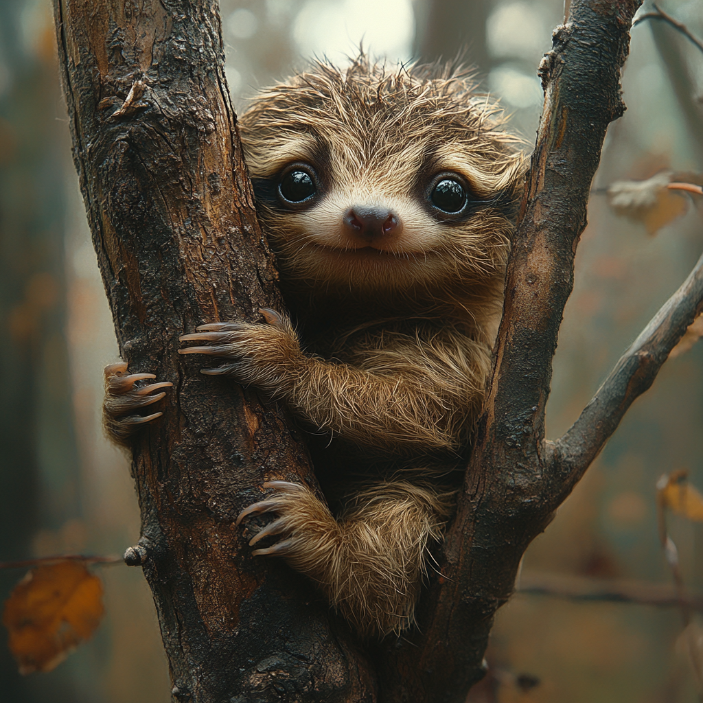 A delightful sloth clings to a tree trunk with wide, curious eyes, radiating charm and innocence amidst a serene forest backdrop. A heartwarming glimpse of nature’s cuteness.